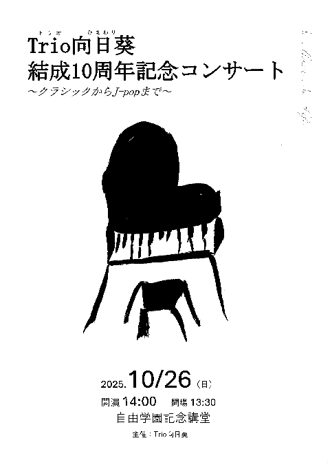 10月26日、自由学園記念講堂にてTrio向日葵結成10周年記念コンサートが行われました。 ピアノ、バイオリン、チェロの三重奏が素敵なTrio向日葵さん。クラシックから日本の曲、JPOPなど誰もが楽しめる曲目であっという間の時間でした。 私、金子はご縁から陰アナウンスとして参加させていただきました。 金丸社長も聴きに来てくださり、10周年をお祝いして大きな花束をプレゼントしてくださいました。 Trio向日葵さんのこれからの活躍も楽しみにしています♪♪ .Trio向日葵